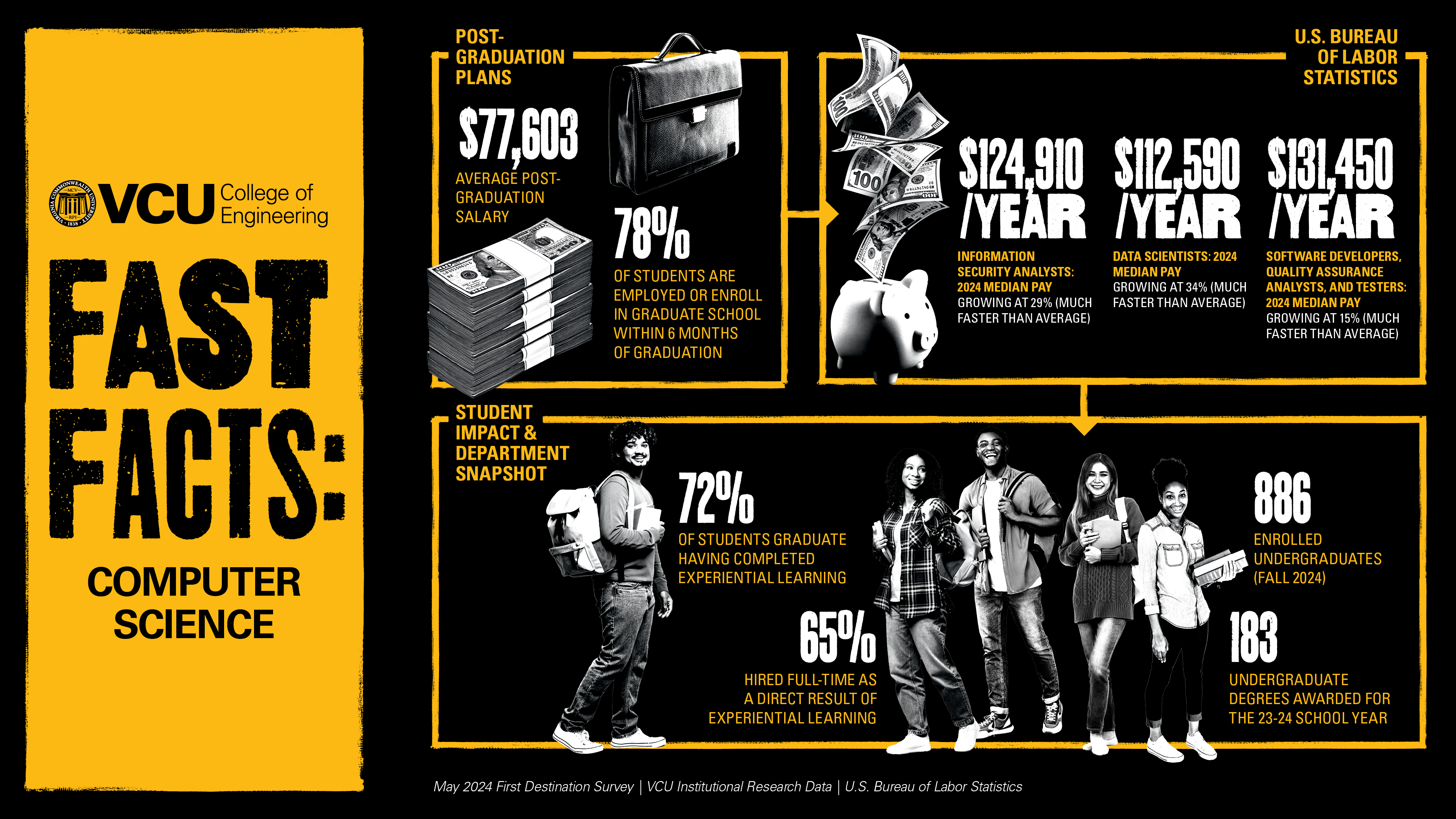 Begin your journey into the fascinating world of cybersecurity, data science, software engineering and computing with a bachelor’s degree in computer science from the Virginia Commonwealth University (VCU) College of Engineering. We have world-class facilities with a strong focus on research. Combined with our industry connections and access to Richmond-area businesses, VCU Engineering is a solid choice for your education and career development.